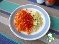 Пока лук жарится, нарезать морковь, сельдерей и чили. Кто не любит острое, уберите у чили семена или не кладите его вовсе. |