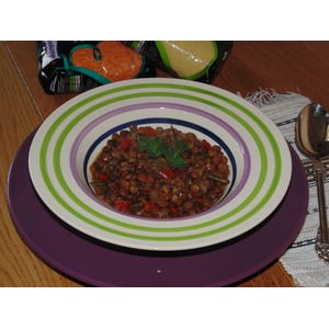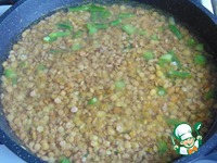 Добавить в сковороду и тушить до готовности чечевицы. Вода не должна вся испариться, чечевица должна быть в подливке. |