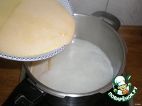 В закипевшее молоко выливаем содержимое миски, варим минут пять, снимаем с плиты, и даём остыть до температуры парного молока, затем вбиваем масло. |