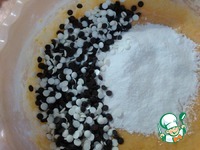 Добавить муку, соду, разрыхлитель и шоколадные дропсы (измельченный шоколад). перемешать до однородности теста |