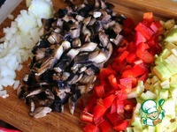 Мелко нарезать лук, чеснок, шампиньоны, болгарский перец, цукини. Обжарить до готовности, смешать с томатной пастой, посолить, поперчить. |