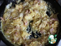 Лук нарезать четверть кольцами. Обжарить на сливочном масле до прозрачности, добавить ветчину, пожарить минуты 2 и влить яйца, все энергично мешать лопаточкой, пока яйца не схватятся. |