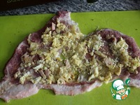 Мясо нарезать на крупные порционные куски толщиной до 1 см и отбить с 2 сторон. |