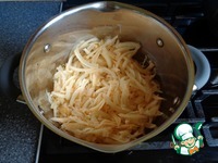 Репу шинкуем крупно и добавим к луку, обжарим три минуты. |