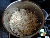 К овощам кладём порезанную тонкой соломкой белокочанную капусту, тушим три минуты. |