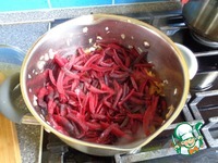 Затем к овощам положим шинкованную на крупной терке свёклу и готовим ещё три минуты. |