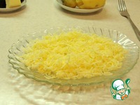 Сыр натереть на мелкой терке и выложить первым слоем на тарелку. |