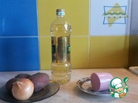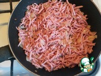 Колбасу трем на крупной терке, добавляем к луку и обжариваем. Готово - отставим в сторону для остывания. |