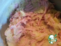 Картофель сварился. Сливаем воду, делаем пюре. Добавляем поджаренные лук с колбасой, перемешиваем. Начинка готова. |