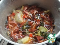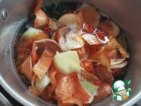 Заливаем эту красоту водой и кипятим минут 15, чтобы вкус продуктов передался бульону. |
