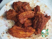 Посмотрим поближе. Тут можно заметить, что мясо получилось сочное. И кстати очень вкусное. Слегка острое из-за красного перца. Чувствуется зелень. |