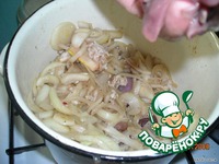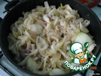 В казанок налить масло, сложить кролика, сверу выложить лук. |