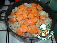 Морковь порезать крупными кружочками, и положить сверху. Посыпать сухим чесноком, перцем-горошком и накрыть крышкой. |