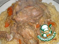 Через 20 минут перемешать и добавить 2 стакана воды. Тушить еще около 1 часа. Отварить лапшу, выложить сверху тушеного кролика и можно подавать. |