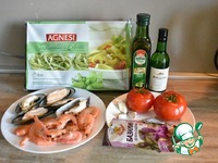 Приготовить ингредиенты- отварить и почистить креветки, промыть мидии от песка. |