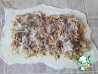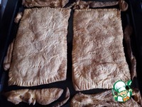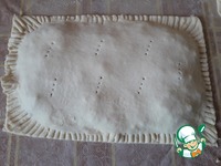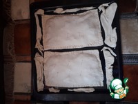 Тесто разделяем на 4 равных прямоугольных части, каждую тонко раскатываем на присыпанной мукой поверхности. |