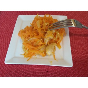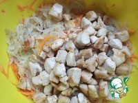 8. Обжарить куриное филе до готовности (в той же сковородке, в которой жарился лук), выложить поверх моркови и лука и перемешать |