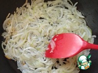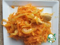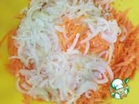 7. Равномерно выложить поджаренный лук на морковь (важно, чтобы лук выкладывался сразу со сковородки: раскаленное масло и горячий лук "запечатывают" морковь и позволяют сохранить все соки) |