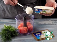 Приготовьте начинку. Лосося нарежьте на небольшие кусочки. Плавленый сыр Hochland в ванночках Сыр смешайте вилкой с мелко нарубленным укропом. Добавьте рыбу и перемешайте все. |