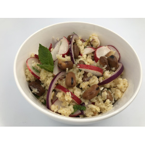 Описание: Салат с булгуром, бобами и мятой. В его состав также входят красный лук и редис.