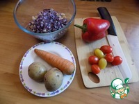 Морковь, картофель и перец болгарский нарезаем мелким кубиком. Отправляем в салатник. Помидоры-черри режем на четвертушки. |