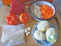 Перец нарезать полосками, помидоры - кубиками. Лук и чеснок измельчить, морковь и сельдерей нашинковать соломкой, |