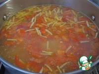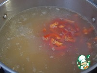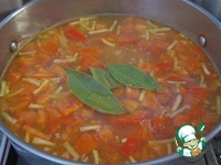 Добавить помидоры и 2-3 лавровых листика, потомить суп еще 2-3 минуты и снять с огня. |