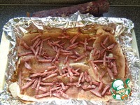 По мясу разложить кусочки копченой колбасы, порезанной соломкой. |