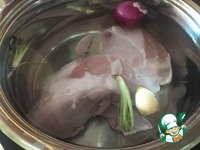Поставить варится бульон на 1,5 часа на маленьком огне. В воду добавить лук, чеснок, лавровый лист, палочки от кинзы или петрушки, можно так же корень сельдерея. Не забывать снимать пену. |