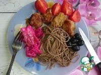 Гарнир - на Ваш выбор. У меня сегодня были капуста от Рыжей лисы :), гречневые макароны, помидорчик и маслины. |