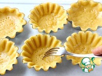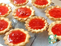 На дно корзинок выкладываем конфитюр, варенье или джем. Я использовала свежую клубничную протирку. |