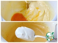 Затем добавляем желтки, продолжаем взбивать, далее добавляем 1 столовую ложку сметаны с небольшой горкой, взбиваем. |