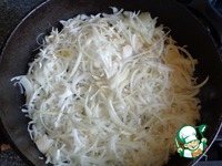 Для овощной подушки репчатый лук нарезаем полукольцами и поджариваем до зарумянивания. |