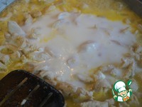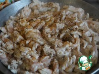 Добавить куриное филе и обжарить 3-4 минуты, пока оно не побелеет. Посолить, поперчить по вкусу. |