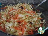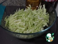 Подготовим наши продукты. Капусту нашинковать, посолить по вкусу и перетереть руками, чтобы капуста стала мягкой. |