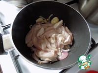 Положила куриное филе, порезанное тонкими кусочками. Немного обжарила. |