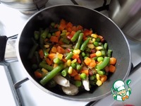Омлет я буду делать с начинкой из куриного филе и овощей микс. Овощной микс я использовала готовый замороженный. Разморозила его в дуршлаге под струёй воды и обсушила бумажным полотенцем. |