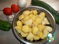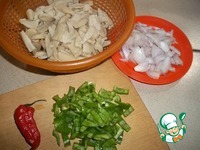 Между тем, отварить грибы в подсоленной воде (у меня свежемороженные вешенки). Нарезать произвольно лук и болгарский перец. |