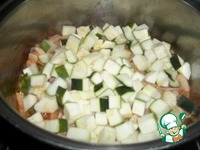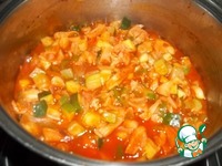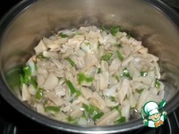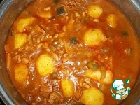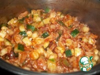 Добавить томатную пасту, смесь перцев, половинку жгучего перчика, соль, жарить, помешивая, 3...5 минут. Влить 1 стакан горячей жидкости (грибной, овощной бульон или воду). |