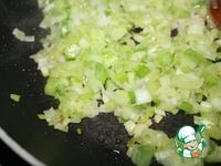 По рецепту у меня лук репчатый, но у меня головки от зеленого лука. Лук мелко режем и обжариваем на трех ложках масла около 5 минут. |