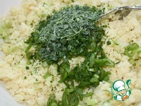 Мелко нарезаем петрушку и перышки лука. Смешиваем кус кус, творог, обжареный лук и петрушку с зеленым луком. Добавляем масло и сок лимона, солим по вкусу. |