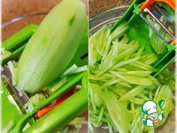 Вот эта овощечистка – очень удобный девайс. И универсальный. Вставляется в станину, можно вот так. И тогда получается вот такая симпатичная соломка. Как Катя и обещала – мелко! |