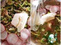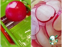 Редиска. Это уже, что называется, необязательное дополнение. У нас в семье не все ее любят, поэтому настрогать-то мы ее настрогали, но в отдельную плошку. |