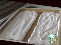 Заранее готовим: пергамент смазываем сливочным маслом или маргарином и немного присыпать мучкой. На пергамент потом укладывается две части будущих коржей из безе – но надо учитывать, что тесто расползается – нельзя чтоб соприкасались!