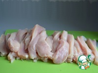 Очистите куриную грудку от жира и хрящей, разрежьте ее на полоски толщиной около 1 см. |