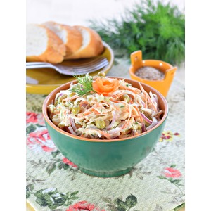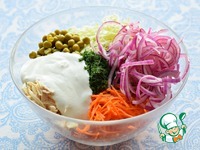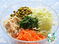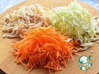 Морковь нарезать тонкой соломкой или натереть на терке для корейских салатов. Капусту нашинковать. Куриное филе, отваренное заранее, разобрать на волокна или нарезать. |