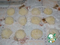 Шарики теста слегка раскатать или примять рукой на столе, разложить в серединки начинку и защипать. |