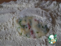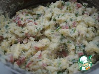 Добавить лук, зелень, душистый перец, сыр и ветчину. Хорошо вымесить до однородной массы. |