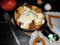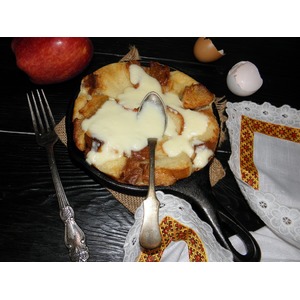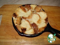 Вынуть сковороду с яблоками из духовки и выложить в нее размоченные кусочки хлеба. Полить остатком молочной смеси и отправить в духовку на 35 минут. |