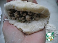 На середину кладу 1 ст. л. мясной начинки и аккуратно защипываю. |